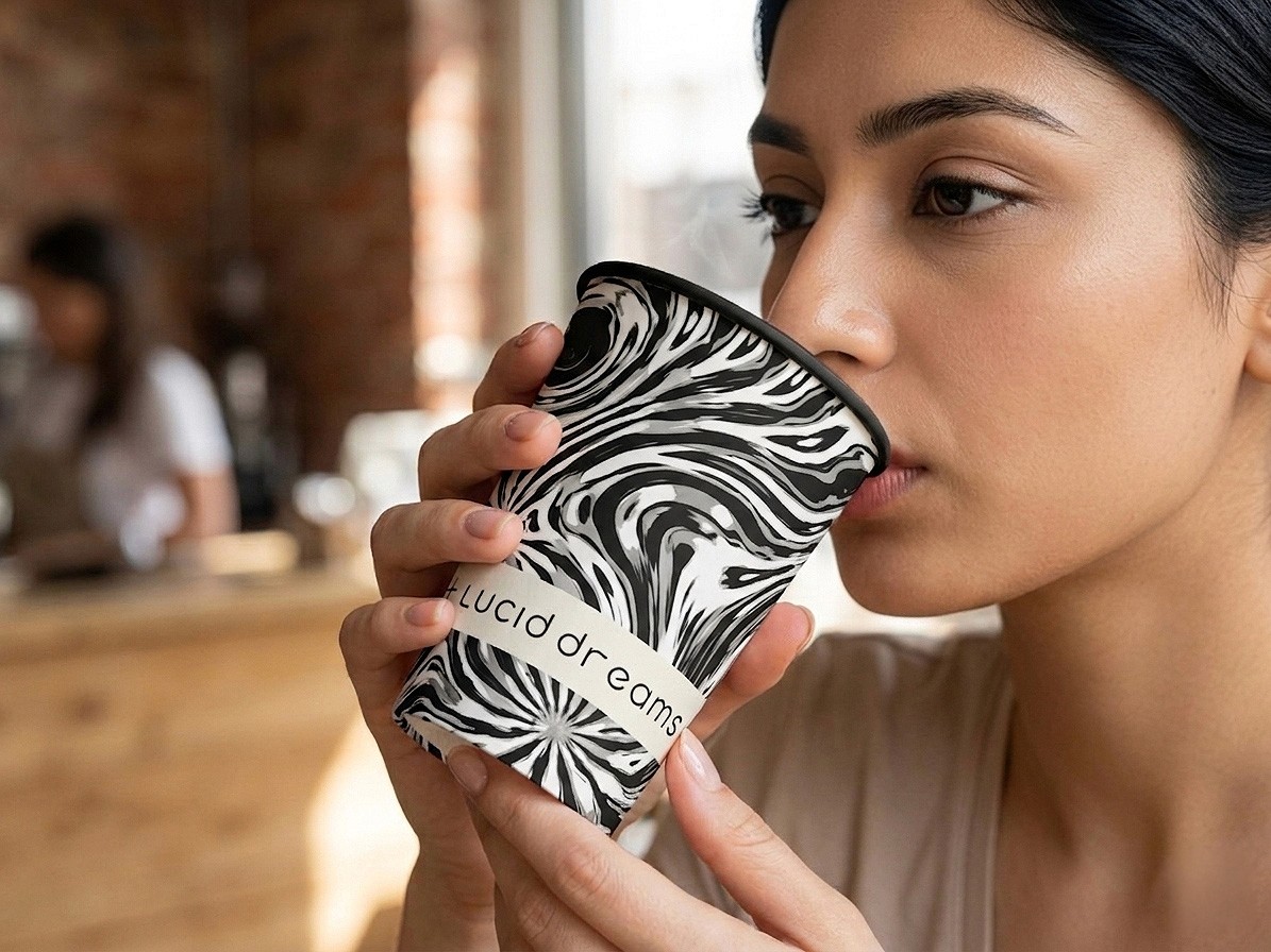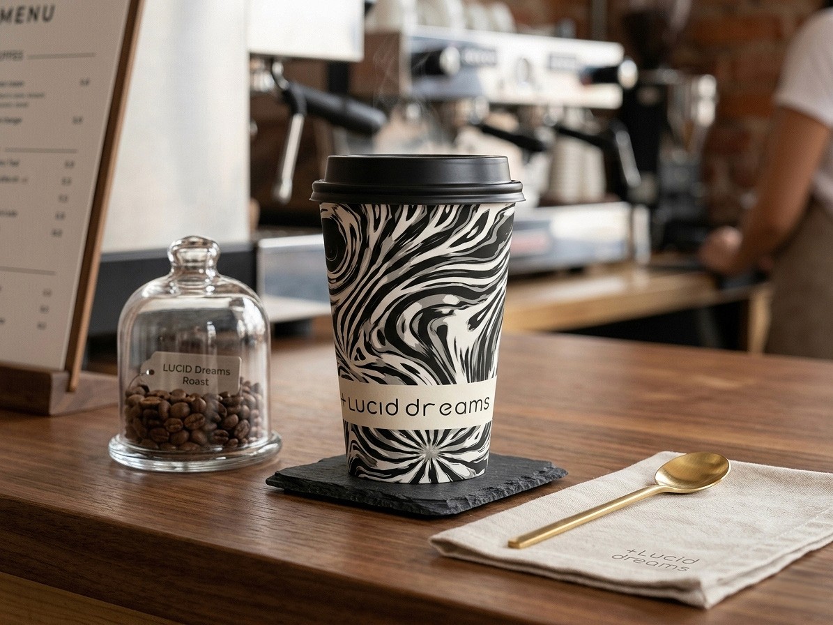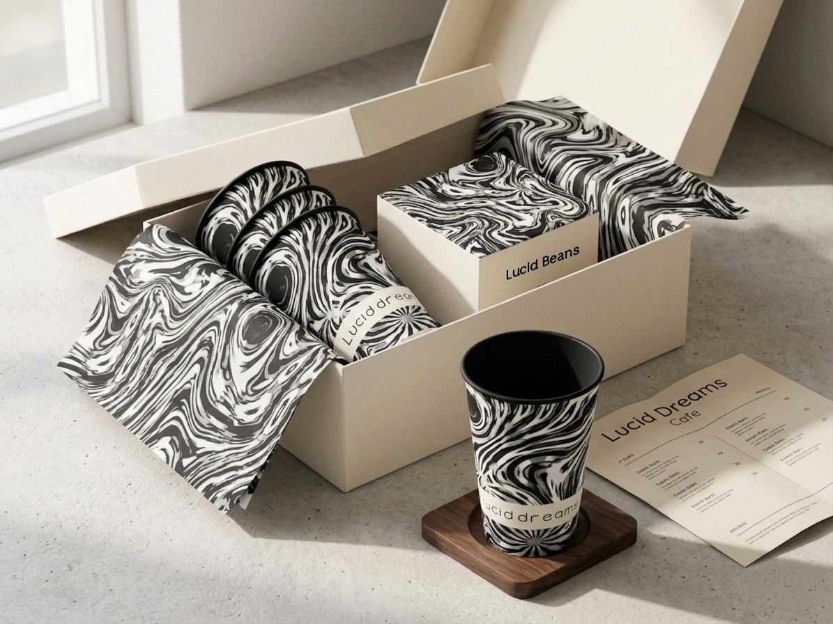 The takeaway packaging was designed to translate this idea into a controlled, abstract visual language, using fluid monochrome patterns to evoke the feeling of a lucid dream without overwhelming the product.